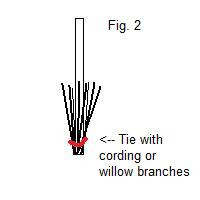 Soak the Birch twigs and Willow strands overnight in warm lightly salted water (to make them pliable) and allow them to dry slightly before using. They need to be damp and pliable before binding them to the Ash shaft. Arrange the twigs alongside the shaft about 3-6 inches from the bottom, larger twigs form the center of the brush with shorter ones around the outside, then bind them with the Willow strands. Be sure to tie them very securely. Use as many layers of twigs as you like depending on how full you want the brush to be. Leave overnight to dry.