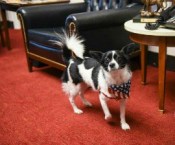 Little Ricky, a dog rescued from the Yulin dog meat festival in 2015, plays in U.S. Rep. Alcee Hastings’ office in Washington, DC. Kevin Wolf/AP Images for HSI