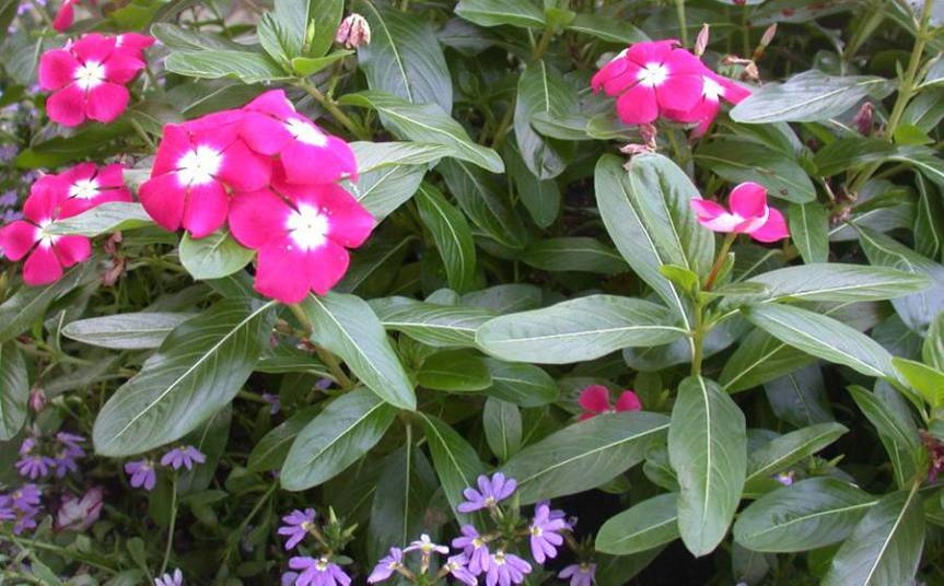 DESCRIPTION:  Perennial vinca is a fast-spreading vine with blue flowers. V. major is a more vigorous grower and has larger leaves and flowers. The annual bedding plant vinca {actually Catharanthus roseus} has attractive five-petaled white and pink-to-red flowers and dark green, glossy leaves. The plants reach a height of 10 to 15 inches and spread almost 2 feet across.