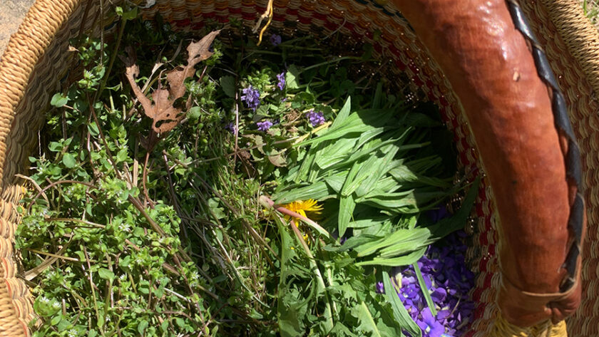 Throughout the year, including on warmer days in the deepest winter months, you will find me out on the land: scattering seeds; planting and harvesting; communing with the plants, trees, and mushrooms; and working nature magic. With baskets overflowing with abundant herbs, nuts, seeds, and mushrooms, I take only what I need, leaning into the abundant plants, and harvest with permission and gratitude. I leave offerings, scatter seeds, and weave magic and flute songs. I often have other people with me–friends, herbal apprentices, visitors, cats, geese. We honor the land while we harvest the plants that heal, soothe, and help us connect with the sacred.
